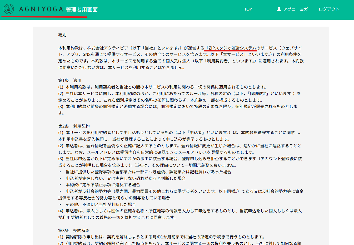 管理画面⇒フッター部分の規約をクリック、下図のようにスクリーンショットをとる