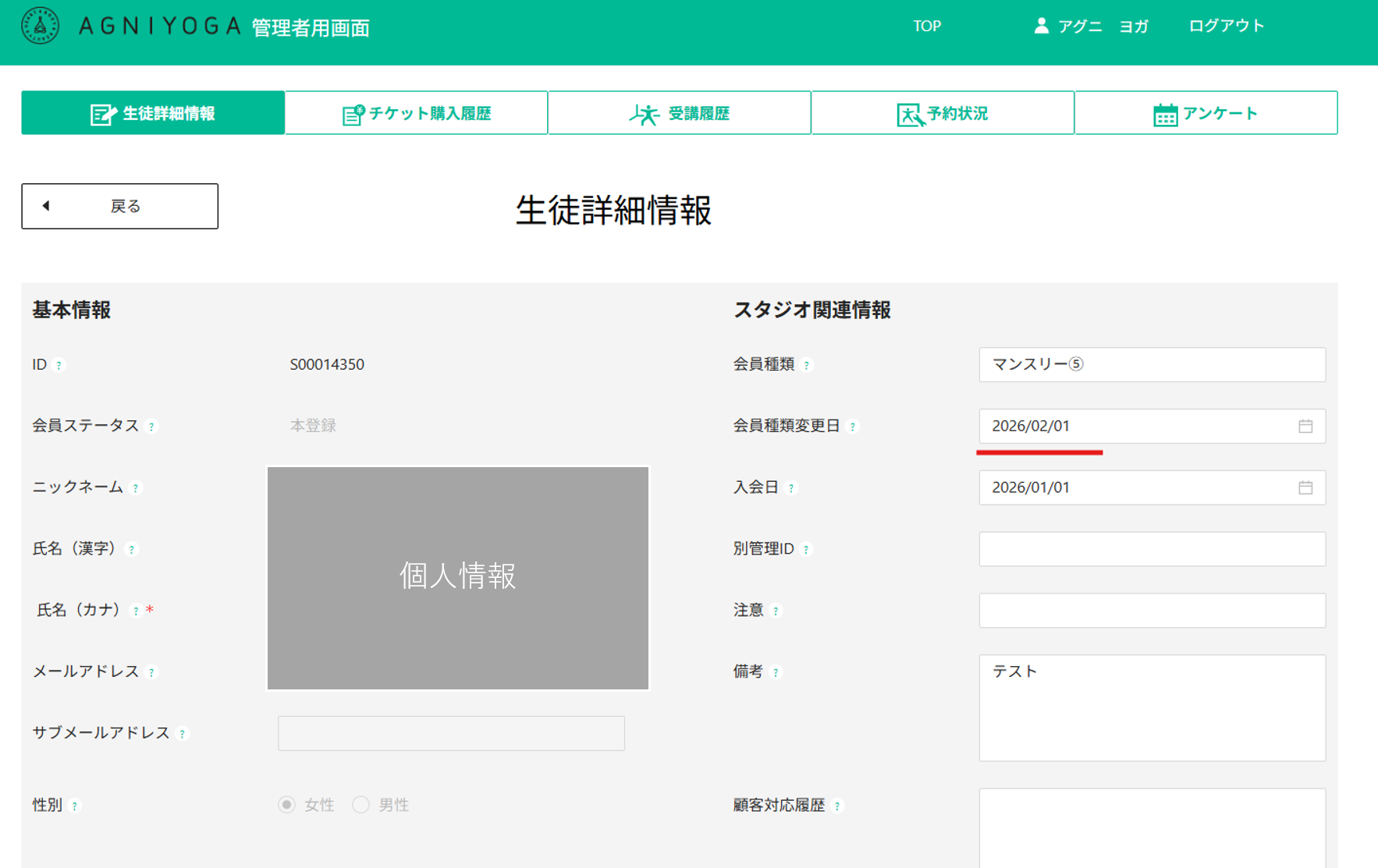 管理画面⇒生徒管理⇒生徒詳細情報より、2026年1月1日以降の会員種類変更日や入会日のデータを表示させスクリーンショットをとる
